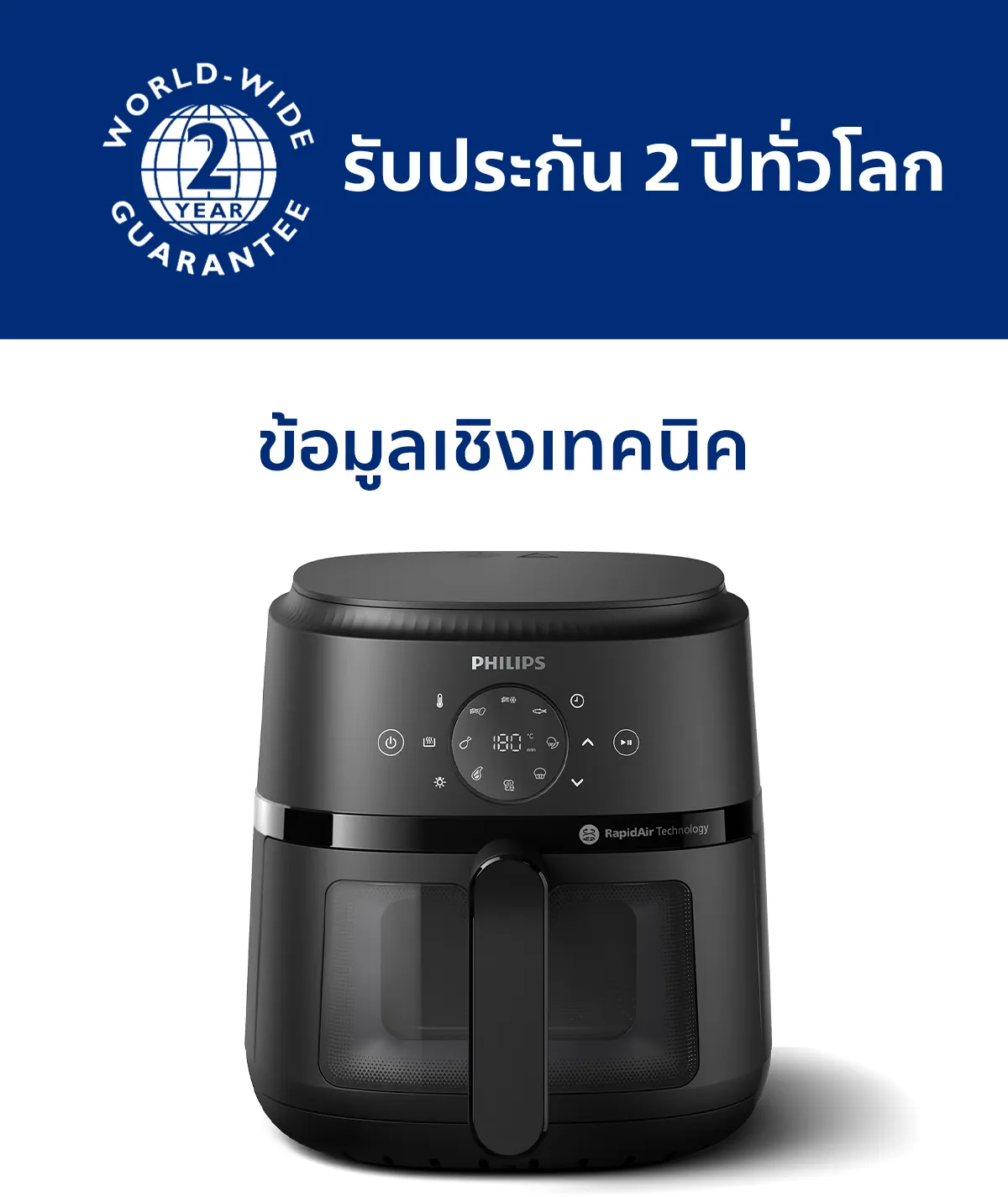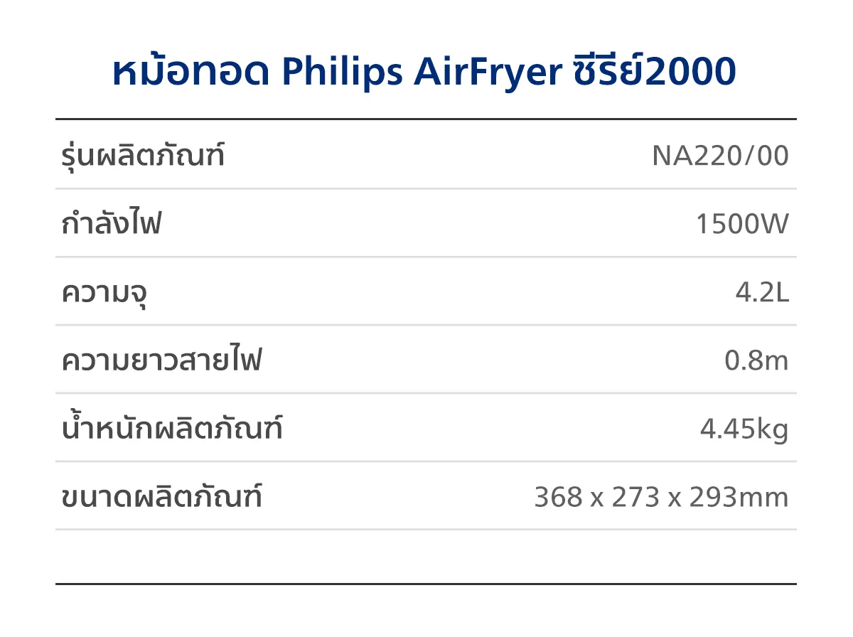 ความจุ 4.2L ระดับความร้อน 4.2 ลิตรใส่มันฝรั่งทอดได้ถึง 500 ก. ใส่น่องไก่ได้ 6 ชิ้น หรือใส่ผักได้ 600 ก.