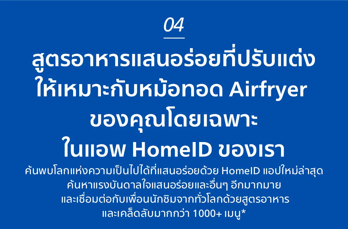 **เปอร์เซ็นต์เฉลี่ยตามการวัดในห้องปฏิบัติการภายในของ Philips Airfryer จากการปรุงสุกอกไก่หนึ่งชิ้น (ตั้งค่า AF ที่ 160 °C โดยไม่อุ่นเครื่องก่อน) หรือแซลมอนแล่ (ตั้งค่า AF ที่ 200 °C โดยไม่อุ่นเครื่องก่อน) เทียบกับการใช้เตาอบเกรดเอ
