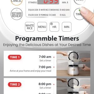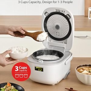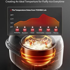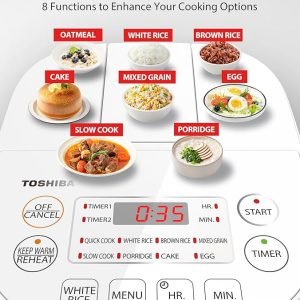 Toshiba Mini Rice Cooker 3 Cup Capacity Mini rice cooker that cooks uncooked rice with steaming and warming functions, fuzzy logic and one-touch cooking, 24-hour delay timer and auto-keep warm feature.
